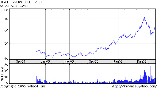 But larger funds are already rumoured to have tested the water. 109 tonnes worth of gold ETFs were bought in the first quarter of 2006, much of it supposedly long term investment. The volume on the downswing was not nearly as much as the volume on the up. And as the previous chart shows, peak volume was reached when gold bottomed out in June. There is currently some 500 tonnes of gold backed by ETFs.