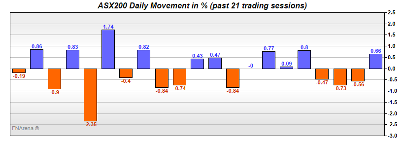There were no particularly sizeable individual stocks moves, with the downside top five dominated by gold miners and the standout on the upside being Harvey Norman ((HVN)), which rose 3.6% in defiance of the sales data, probably because Gerry refuses to give back the company’s JobKeeper windfall.