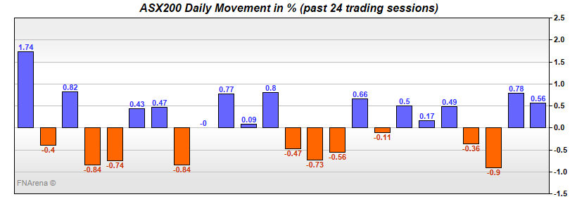 After two sessions in which the futures had suggested significant gains in the morning, only for the ASX200 to close down on the day, yesterday the futures got it right. They had closed up 56 before the open and the index ultimately closed up 52.