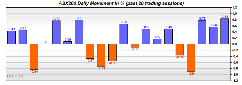 The ASX200 wobbled and wavered from the opening on Thursday, toying with the 6800 level, before finally setting upon an upward trend. Failure then looked inevitable in the early afternoon before a late kicker had the index closing on its highs.