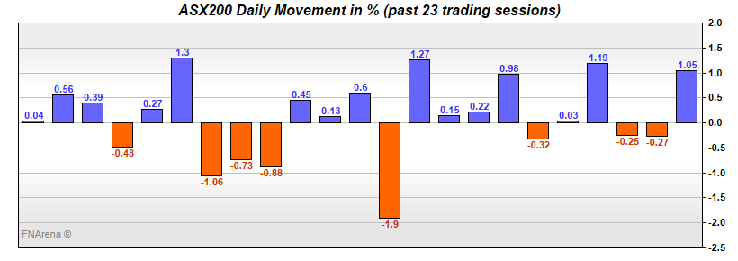 The ASX200 was down -44 points to 11.30am yesterday to start the month on an uncertain note, but it appears the release of the current account numbers sparked some excitement. The index was back to square post the RBA statement at 2.30pm release but drifted off to the close.