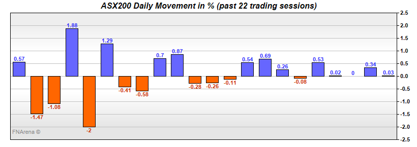 After a very volatile morning the ASX200 yesterday hit a peak of up over 50 points at midday before settling back, again, into a steady afternoon. On Monday the resource sectors were the biggest drag on the index, and yesterday they were the biggest drivers.