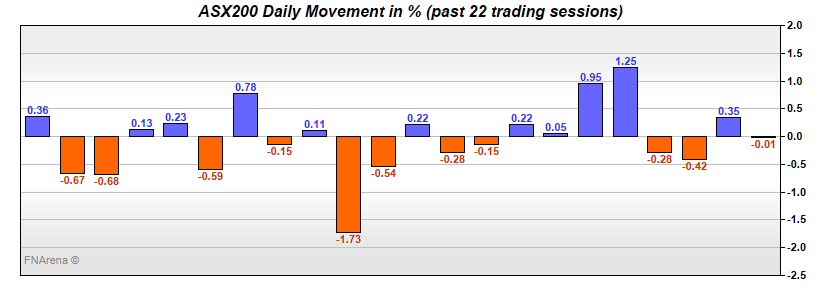 All other sector moves were relatively benign in a total of six up and five down. Financials provided the biggest counter (-0.3%) not led by the banks but by the insurers, with all of Insurance Australia Group ((IAG)), nib Holdings ((NHF)) and QBE Insurance ((QBE)) making the top five index losers.