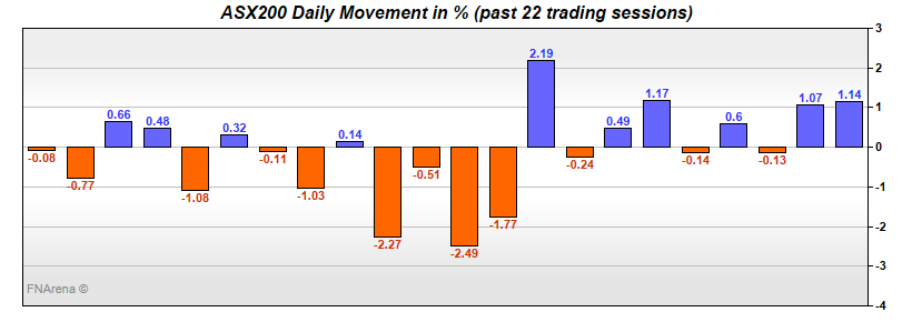 After a soft close on Wall Street, our futures were showing down -11 points yesterday morning. Not sure why, as from the opening bell the ASX200 shot up in a straight line to hit 7200 at midday. This prompted some afternoon selling, but the buyers fought back.